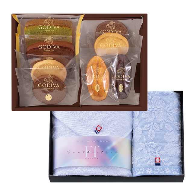 ベルギー産チョコレートを使用したゴディバの焼き菓子と、ふっくらとした肌触りの今治タオルのセット。