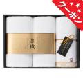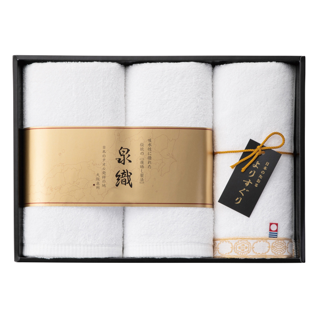 日本のタオルの2大名産地であるやわらかく吸水のよい甘撚り糸を使用した泉州タオルと、心地良い純白の今治タオルをセットしたギフトです。