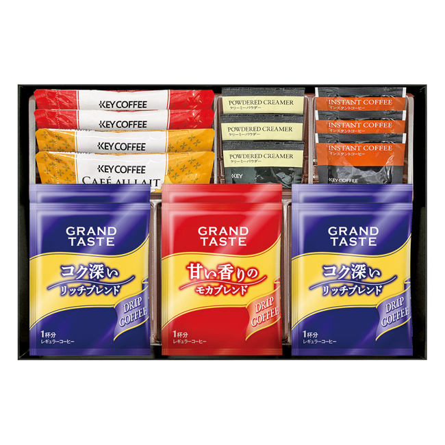 | 内容 | キーコーヒードリップ(リッチブレンド6g×4、モカブレンド6g×2)、キーコーヒースティック(カフェオレ7g・カフェモカ7.8g各2)、キーコーヒーインスタントコーヒー2g・キーコーヒークリーミーパウダー2.5g各3 賞味期限:製造日から360日 |