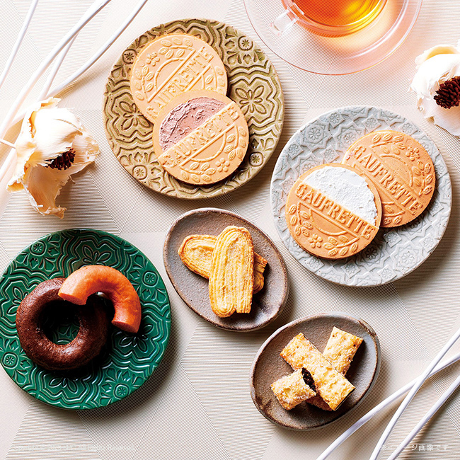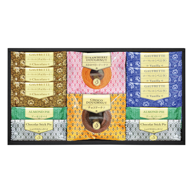 | 内容 | ゴーフレット(バニラ・チョコ各3)、焼ドーナツ(チョコ・ストロベリー各1)、アーモンドパイ・ショコラスティックパイ各2 賞味期限:製造日から180日 |