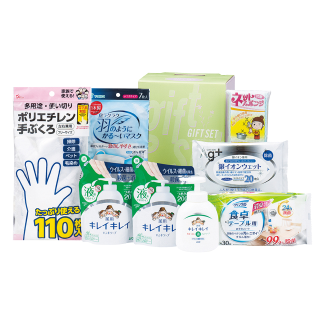 | 内容 | ライオンキレイキレイ薬用液体ハンドソープ詰替用200ml×2、ライオンキレイキレイ薬用液体ハンドソープ250ml・国産不織布マスク(7枚入)・クリンクル食卓テーブル用シート(30枚入)・ネットスポンジ・銀イオンウェット(20枚入)・ポリエチレン手ぶくろ(110枚入)各1 |