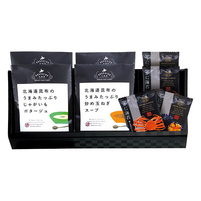 | 内容 | 北海道昆布うまみたっぷり(たまねぎスープ×2・じゃがいもポタージュ・コーンポタージュ)・ふりかけ(かに海苔・うに海苔)2g×各2 賞味期限:製造日より常温で180日間 |