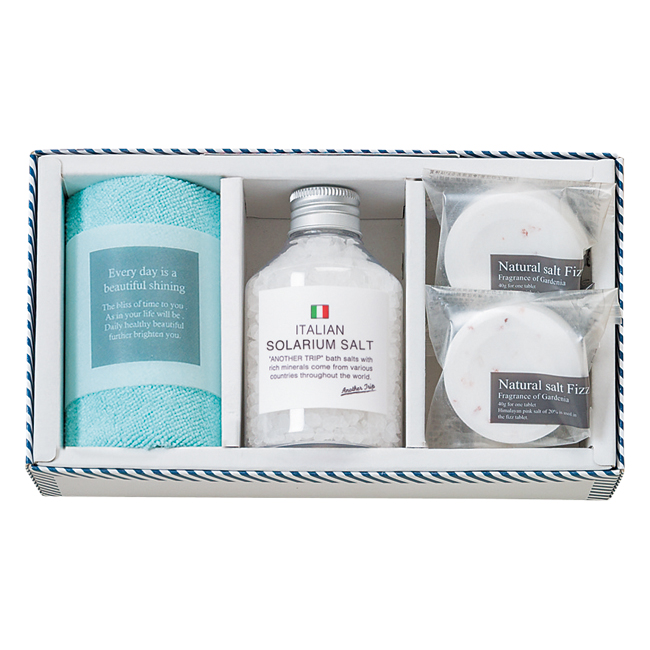 | 内容 | バスソルト(イタリア)180g・マイクロファイバークロス:25×25cm×各1、ソルト・フィズ40g×2 |