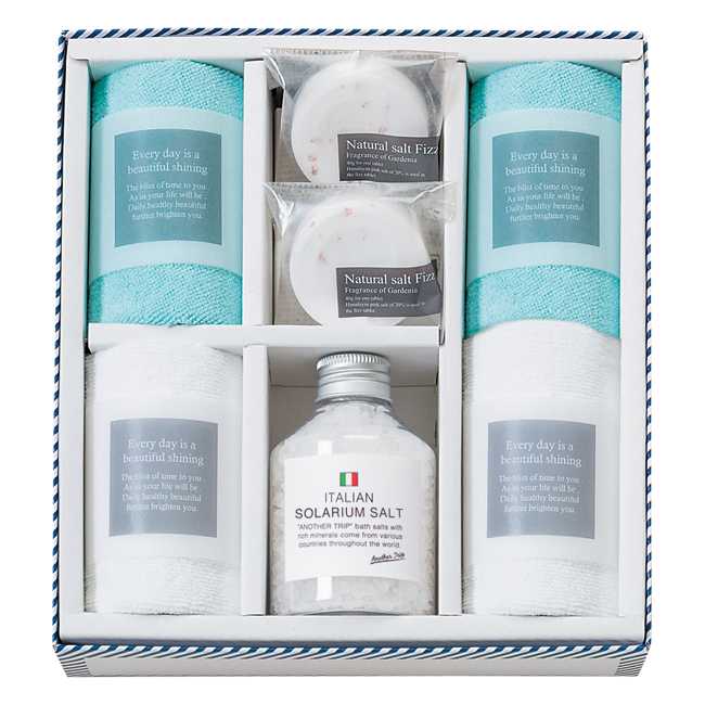 | 内容 | バスソルト(イタリア)180g×1、マイクロファイバークロス:25×25cm×4、ソルト・フィズ40g×2 |