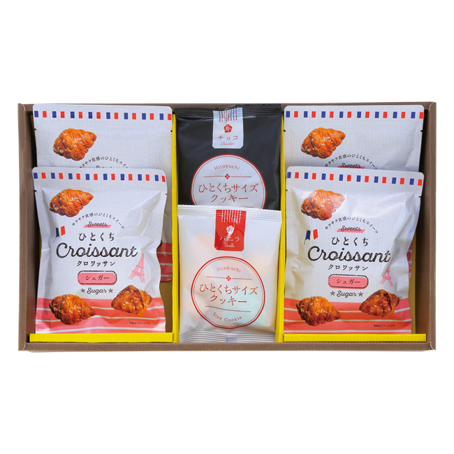 | 内容 | ひとくちクロワッサン×4、ひとくちクッキー(バニラ・チョコ)×各1 賞味期限:製造日から360日 |