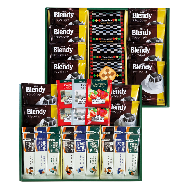 | 内容 | チェスティアクッキー×15、AGFブレンディコーヒードリップ式7g×12、紅茶(アールグレイ・イングリッシュブレックファースト・ストロベリー)2g×各2、AGFブレンディスティック(エスプレッソオレ5.8g・カフェオレハーフ5.4g・カフェオレ8.2g)×各6 賞味期限:製造日から180日 |